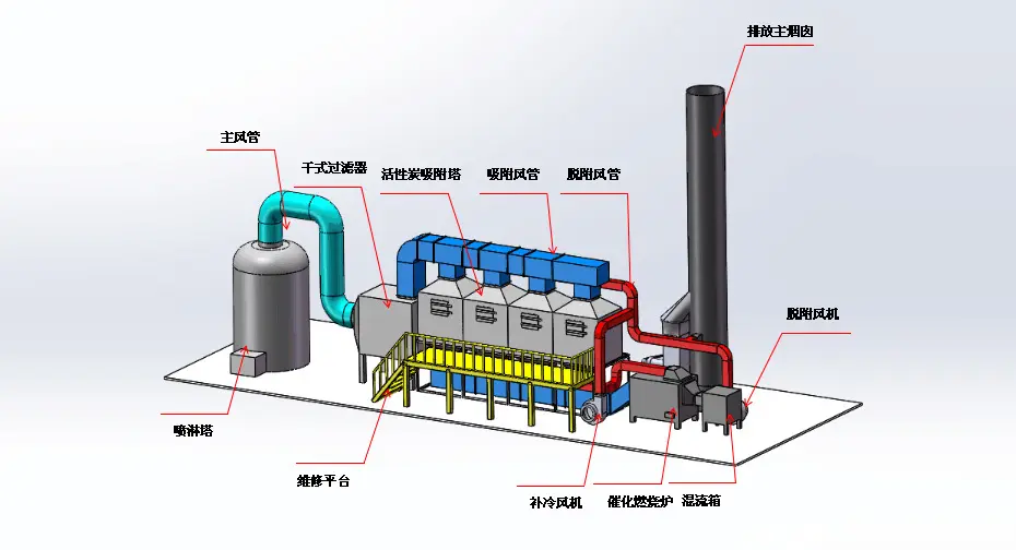 廢氣經(jīng)收集、預(yù)處理后進(jìn)入活性炭吸附裝置。氣體在活性炭床中停留很長時(shí)間。氣體中的揮發(fā)性有機(jī)化合物被吸附在活性炭表面。潔凈氣體從活性炭床排出后,可通過引風(fēng)機(jī)直接排空。RCO處理后的清潔氣體經(jīng)換熱至一定溫度后作為解吸空氣,經(jīng)活性炭床解吸,從活性炭吸附裝置解吸出來的精礦進(jìn)入RCO裝置,經(jīng)貴金屬催化劑分解。分解溫度為200-250℃,廢氣被分解成二氧化碳和水,在利用。廢氣解吸分解完成后排入煙囪達(dá)標(biāo)排放