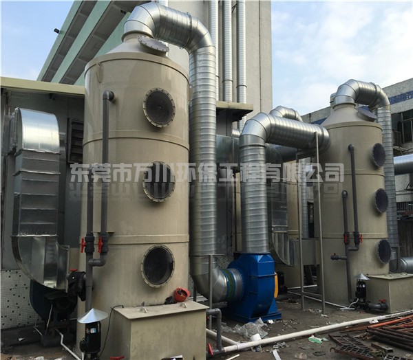 根據(jù)氨氣具有易溶于水的特點,氨氣可以使用噴淋塔處理。氨氣廢氣從風管進入噴淋塔,經(jīng)過噴淋層,噴淋頭不斷的向下噴水,由下到上不間斷地噴水,氨氣的濃度越來越低,最后達標排放,收集起來的氨水還可以重新利用。